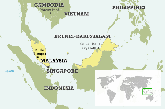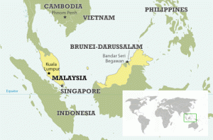 BRUNEI – officially the Nation of Brunei, “the Abode of Peace,” is a sovereign state located on the north coast of the island of Borneo, in Southeast Asia. Apart from its coastline with the South China Sea, it is completely surrounded by the state of Sarawak, Malaysia, and it is separated into two parts by the Sarawak district of Limbang. It is the only sovereign state completely on the island of Borneo, with the remainder of the island belonging to Malaysia and Indonesia. Brunei’s population was 401,890 in July 2011. (Wikipedia)