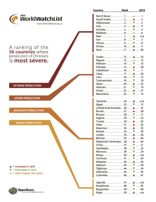 Information and watch list from the non denominational group http://www.OpenDoorsUSA.org. Rankings released January 8,2013 –