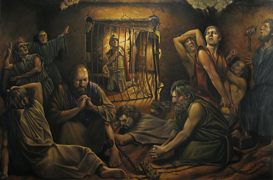 25 Around midnight Paul and Silas were praying and singing hymns to God, and the other prisoners were listening. 26 Suddenly, there was a massive earthquake, and the prison was shaken to its foundations. All the doors immediately flew open, and the chains of every prisoner fell off! 27 The jailer woke up to see the prison doors wide open. He assumed the prisoners had escaped, so he drew his sword to kill himself. 28 But Paul shouted to him, “Stop! Don’t kill yourself! We are all here!”