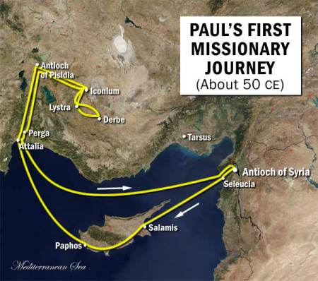 Acts 13:13-16, 26-33, 38-39, 42-43 (NLT) – Paul and his companions then left Paphos by ship for Pamphylia, landing at the port town of Perga. There John Mark left them and returned to Jerusalem. But Paul and Barnabas traveled inland to Antioch of Pisidia.