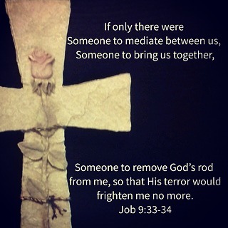 + I need a mediator – “God is not a mortal like me, so I cannot argue with him or take him to trial. If only there were a mediator between us, someone who could bring us together. The mediator could make God stop beating me, and I would no longer live in terror of his punishment. Then I could speak to him without fear, but I cannot do that in my own strength.