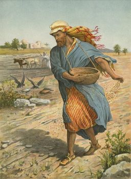 + The Story – “Listen! A farmer went out to plant some seed. As he scattered it across his field, some of the seed fell on a footpath, and the birds came and ate it. Other seed fell on shallow soil with underlying rock. The seed sprouted quickly because the soil was shallow. But the plant soon wilted under the hot sun, and since it didn’t have deep roots, it died. Other seed fell among thorns that grew up and choked out the tender plants so they produced no grain. Still other seeds fell on fertile soil, and they sprouted, grew, and produced a crop that was thirty, sixty, and even a hundred times as much as had been planted!” Then he said, “Anyone with ears to hear should listen and understand.”