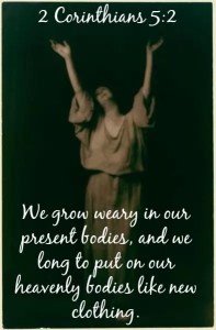 4:5 For we know that when this earthly tent we live in is taken down (that is, when we die and leave this earthly body), we will have a house in heaven, an eternal body made for us by God himself and not by human hands. We grow weary in our present bodies, and we long to put on our heavenly bodies like new clothing. For we will put on heavenly bodies; we will not be spirits without bodies. While we live in these earthly bodies, we groan and sigh, but it’s not that we want to die and get rid of these bodies that clothe us. Rather, we want to put on our new bodies so that these dying bodies will be swallowed up by life. God himself has prepared us for this, and as a guarantee he has given us his Holy Spirit.