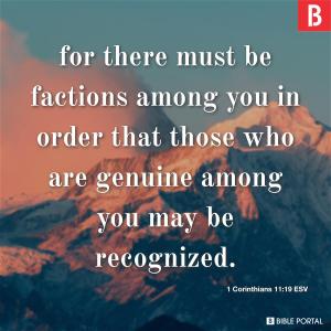 11:17 I have no praise for you as I instruct you in the following matter: When you gather, it results in more harm than good. In the first place, I hear that when you gather as a church you split up into opposing groups. I believe some of what I hear. Factions have to exist in order to make it clear who the genuine believers among you. When you gather in the same place, you can’t possibly be eating the Lord’s Supper. Each of you eats his own supper ⌞without waiting for each other⌟. So one person goes hungry and another gets drunk. Don’t you have homes in which to eat and drink? Do you despise God’s church and embarrass people who don’t have anything to eat? What can I say to you? Should I praise you? I won’t praise you for this.