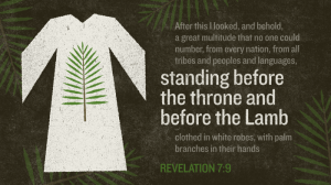 7:9 After these things I saw a large crowd from every nation, tribe, people, and language. No one was able to count how many people there were. They were standing in front of the throne and the lamb. They were wearing white robes, holding palm branches in their hands, and crying out in a loud voice, “Salvation belongs to our God, who sits on the throne, and to the lamb!”
