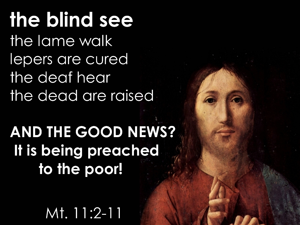 Jesus told them, “Go back to John and tell him what you have heard and seen—the blind see, the lame walk, those with leprosy are cured, the deaf hear, the dead are raised to life, and the Good News is being preached to the poor.” And he added, “God blesses those who do not fall away because of me.”