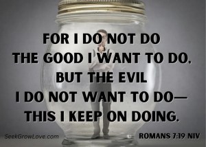 + Slave to our sinful nature – And I know that nothing good lives in me, that is, in my sinful nature. I want to do what is right, but I can’t. I want to do what is good, but I don’t. I don’t want to do what is wrong, but I do it anyway. But if I do what I don’t want to do, I am not really the one doing wrong; it is sin living in me that does it.