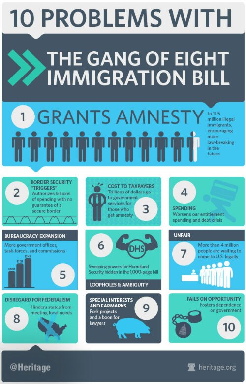 2. BORDER Despite claims of security—and talk of amending the bill—the Gang of Eight immigration bill doesn’t secure the border. Instead, it “delivers nothing new—other than the promise of spending a lot more money and running up our debt.” As James Carafano, Heritage’s E. W. Richardson Fellow, explains: “Amnesty immediately creates an incentive for illegal border crossings and overstays. Thus, the bill’s strategy would drive up the cost of securing the border.”