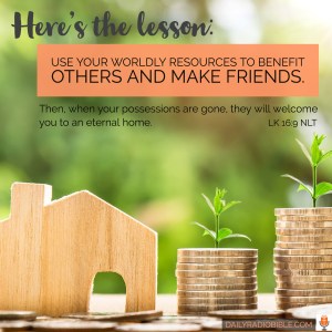 “The rich man had to admire the dishonest rascal for being so shrewd. And it is true that the children of this world are more shrewd in dealing with the world around them than are the children of the light. Here’s the lesson: Use your worldly resources to benefit others and make friends. Then, when your possessions are gone, they will welcome you to an eternal home.