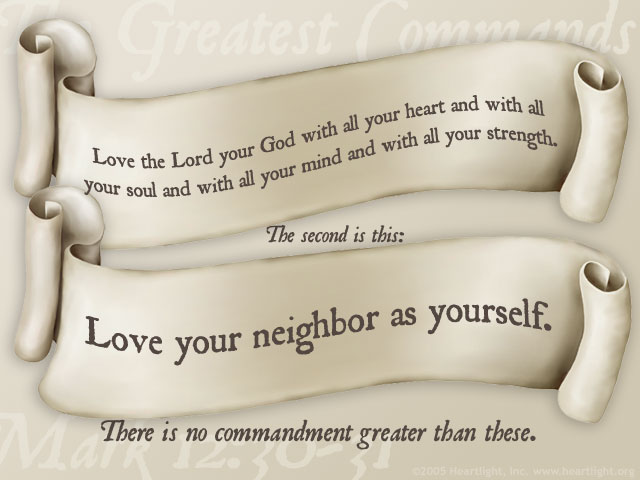 Jesus replied, “The most important commandment is this: ‘Listen, O Israel! The Lord our God is the one and only Lord. And you must love the Lord your God with all your heart, all your soul, all your mind, and all your strength.’ The second is equally important: ‘Love your neighbor as yourself.’ No other commandment is greater than these.”